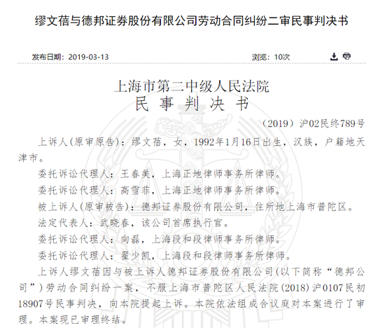 3月14日消息,近日裁判文书网公布了一则德邦证券与员工之间的劳务合同纠纷案一审、二审的判决书。德邦证券原项目经理缪文蓓要求德邦证券支付2016年度应发未发递延奖金及加班工资共计13万。