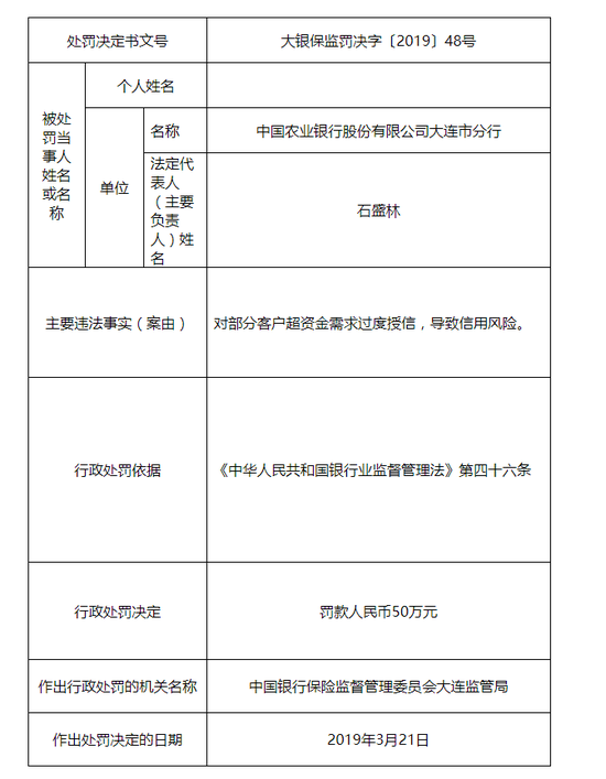 大连银保监局决定对中国农业银行股份有限公司大连市分行罚款人民币50万元。