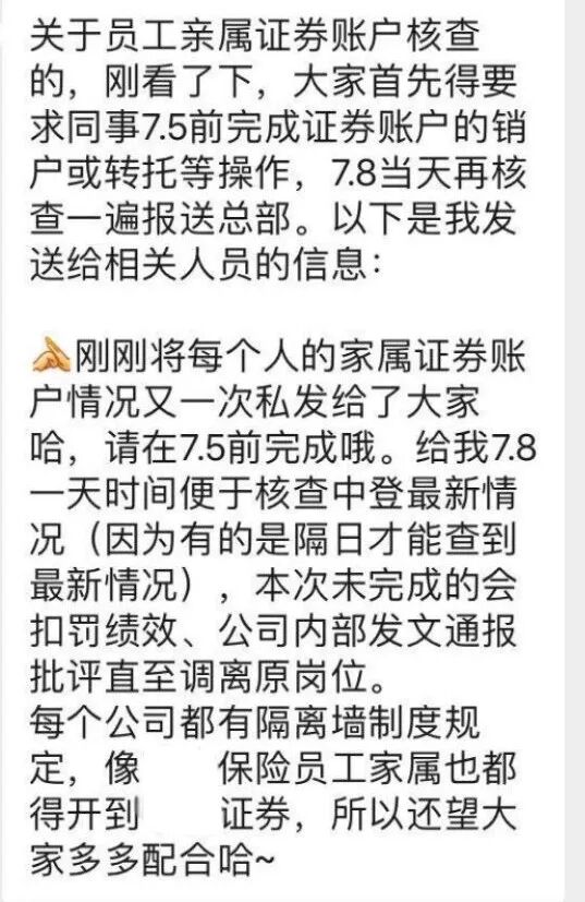 事实上,除证券公司外,券商系公募基金也会对员工亲属账户进行密切关注。一位长城基金工作人员亲属透露,自己此前就被要求将股票账户转托管至长城证券,哪怕该账户已经处于休眠状态。而另一位平安基金员工则表示,入职时需上报亲属股票账户,但并未收到进一步的管控通知。