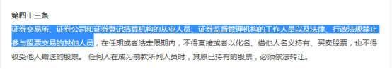 证券交易所、证券公司和证券登记结算机构的从业人员、证券监督管理机构的工作人员以及法律、行政法规禁止参与股票交易的其他人员,在任期或者法定限期内,不得直接或者以化名、借他人名义持有、买卖股票,也不得收受他人赠送的股票。任何人在成为前款所列人员时,其原已持有的股票,必须依法转让。