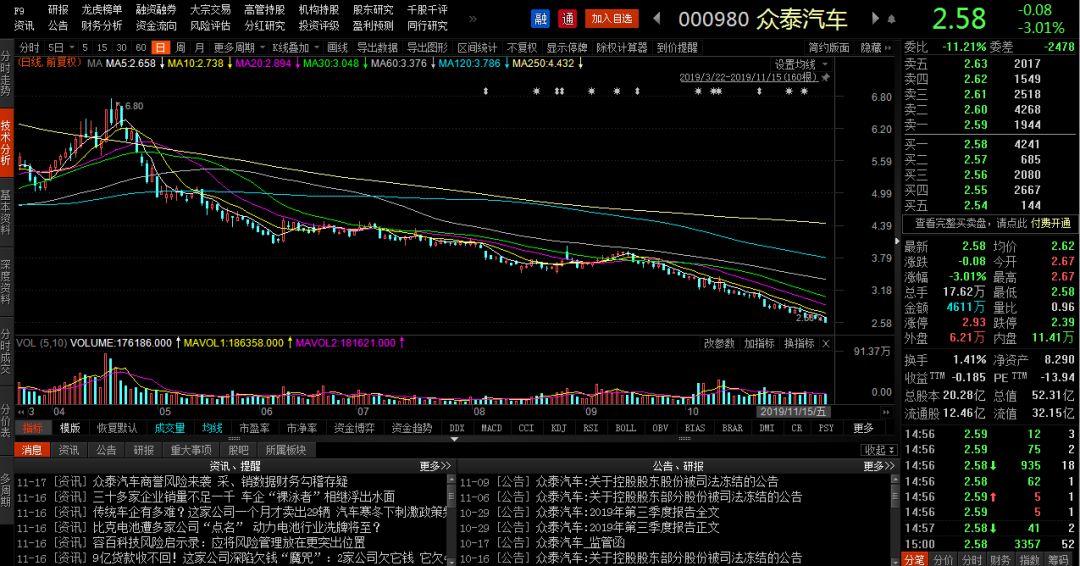 此前的10月15日晚间,众泰汽车发布了关于控股股东部分股份被司法冻结的公告。该公告称,众泰汽车控股股东铁牛集团有限公司持有的6.20%众泰汽车股份被司法冻结。