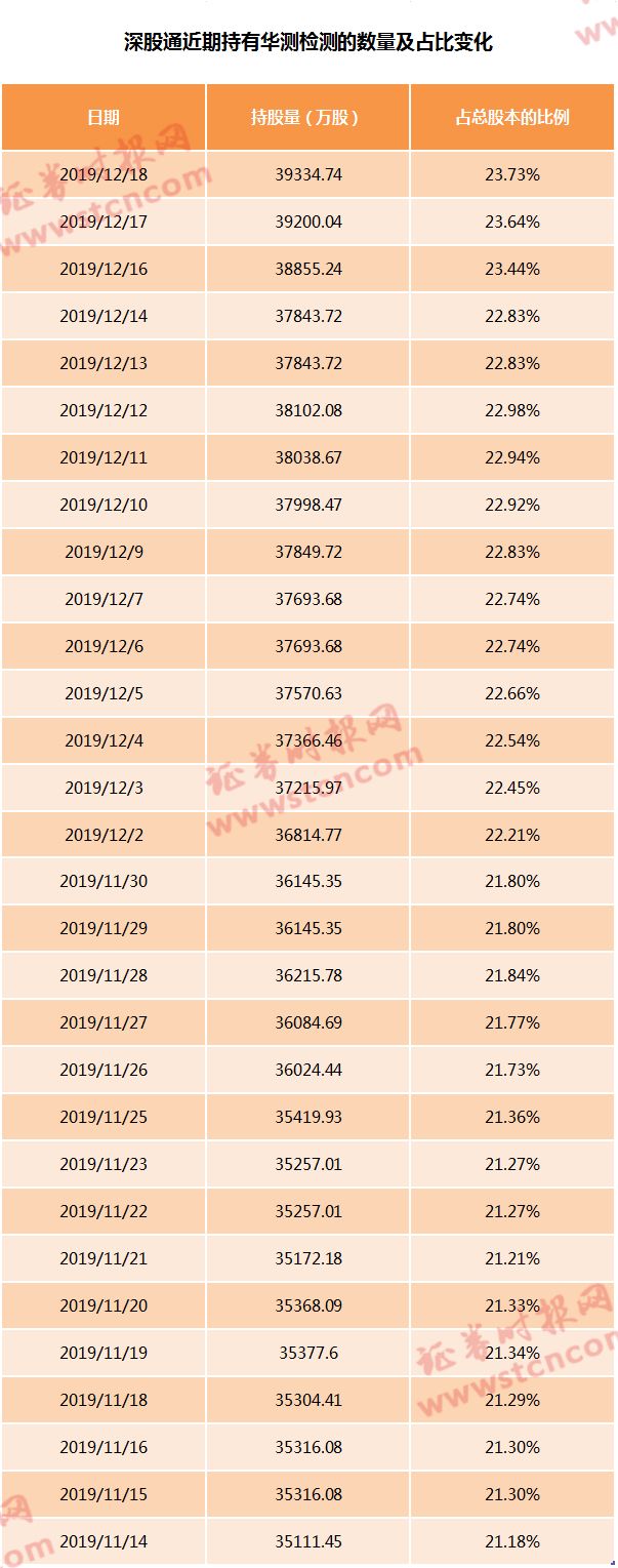 今年初开始,深股通持有的华测检测股票数量再次持续上升,今年7月占比开始突破20%,近期则进一步加速买入。截至12月18日收盘,深股通持有华测检测已达到39334.74万股,占公司总股本的比例为23.73%。