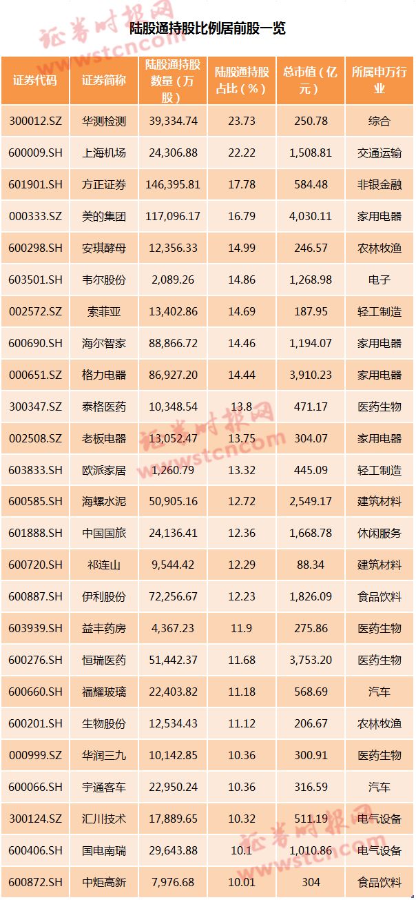 据Wind数据,单看陆股通持股比例,目前最高的是华测检测,为23.73%。