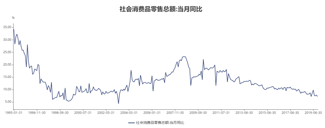 这可能是需求下降的一个缩影。而从全社会的消费品零售数据(据WIND数据)来看,其增速亦呈现连续下行的趋势。
