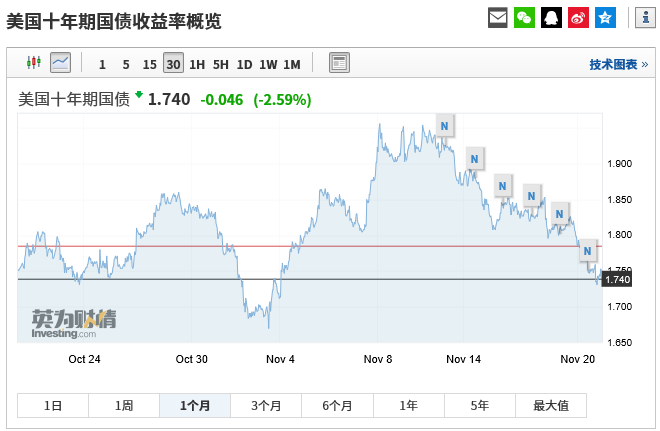 美国十年期国债收益率已经从11月8日的最高点至今,已经下跌了216个基点。